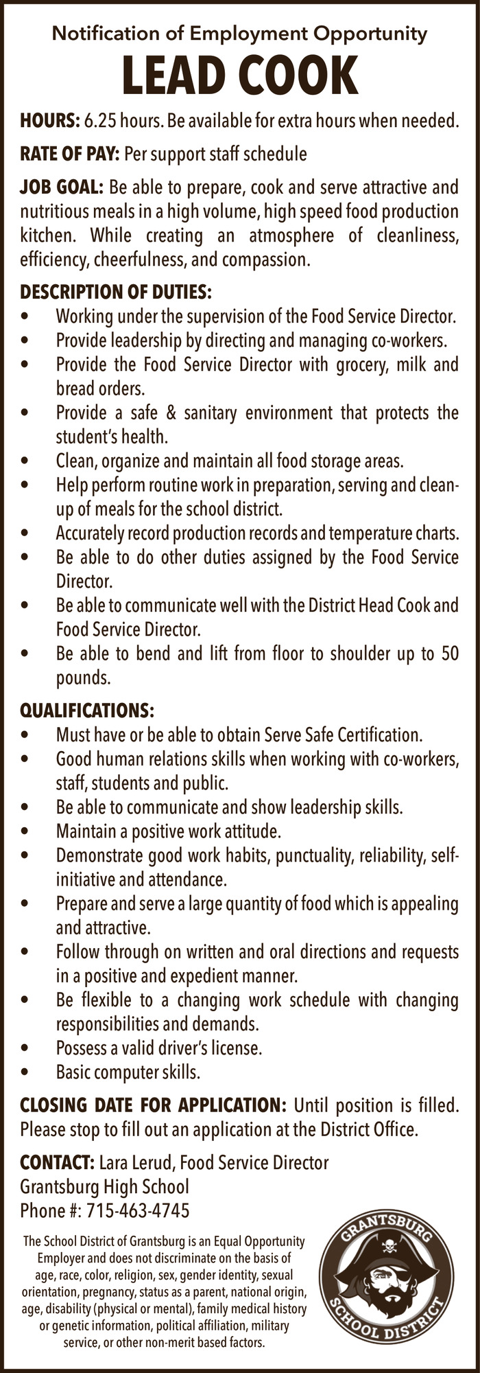 • Lead Cook Position Available in Grantsburg, WI