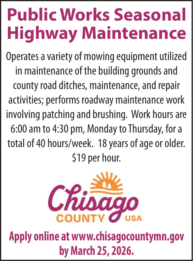 Mar 13, 2026. Chisago County Jobs from Isanti Chisago County Star