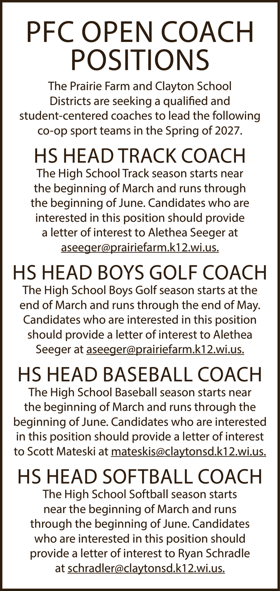 PFC Open Coach Positions