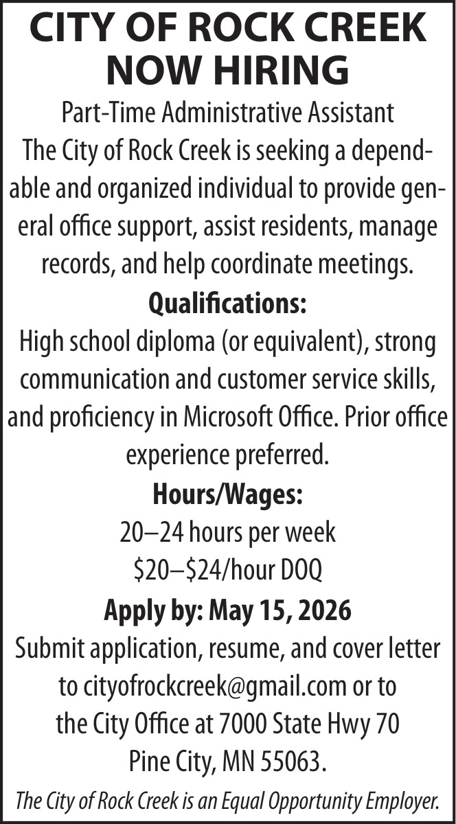 Apr 24, 2026. City Of Rock Creek Jobs from Pine City Pioneer