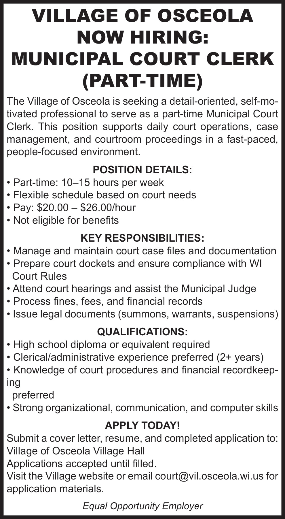 Apr 24, 2026. Village of Osceola Jobs from The Sun