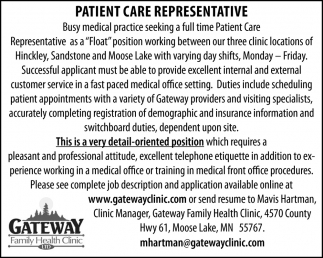 Apr 13, 2021. Gateway Family Health Clinic Jobs from Moose Lake Star Gazette