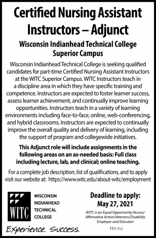 May 12, 2021. Wisconsin Indianhead Technical College Jobs from Burnett County Sentinel