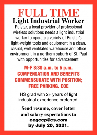 Jul 13, 2021. Pulstar Jobs from White Bear Press
