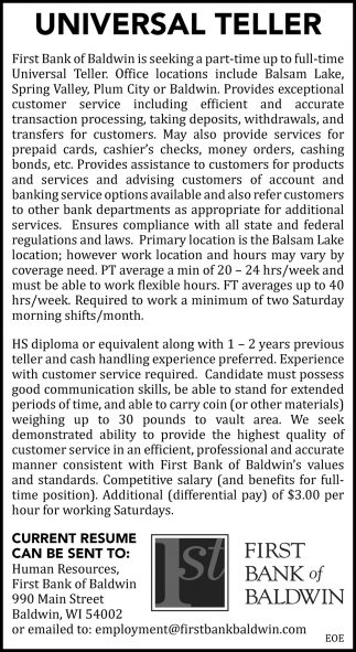 Mar 17, 2020. First Bank Of Baldwin Jobs from Amery Free Press