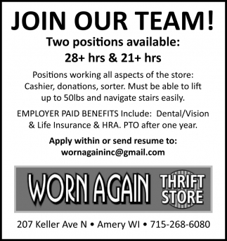Nov 02, 2021. Worn Again Thrift Store Jobs from Amery Free Press