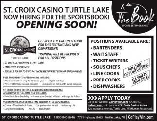Feb 08, 2022. St. Croix Casino Of Turtle Lake Jobs from Amery Free Press