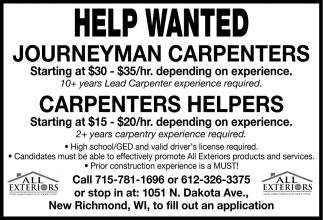 • Journeyman Carpenters Wanted in New Richmond, WI