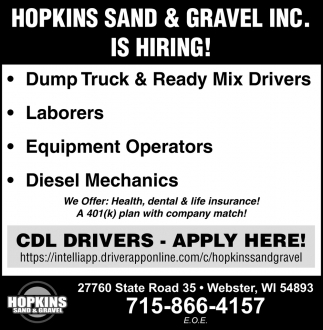 Apr 05, 2022. Hopkins Sand & Gravel Jobs from Burnett County Sentinel