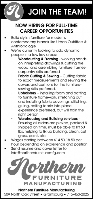 Jun 21, 2022. Northern Furniture Manufacturing Jobs from Burnett County Sentinel