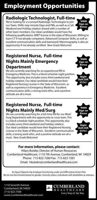 Jul 19, 2022. Cumberland Healthcare Jobs from Amery Free Press