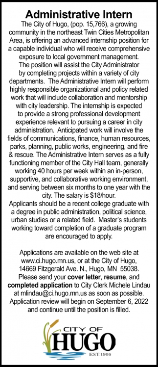 Aug 22, 2022. City Of Hugo Jobs from White Bear Press