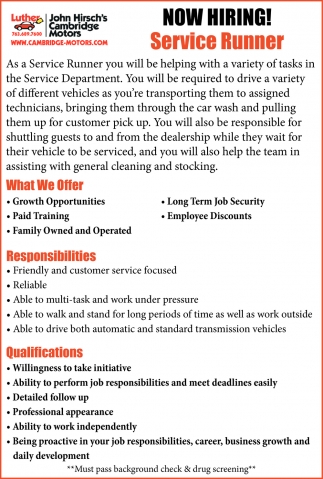• Service Runner Job Opening in Cambridge, MN