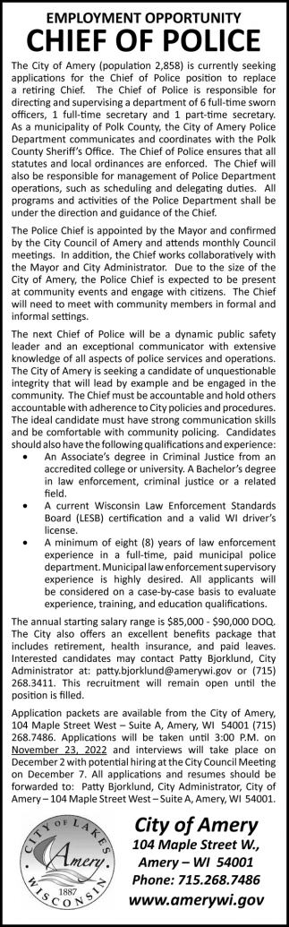 Nov 08, 2022. City Of Amery Jobs from Amery Free Press