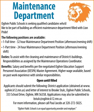 • Maintenance Department Job Opportunity in Ogilvie, MN