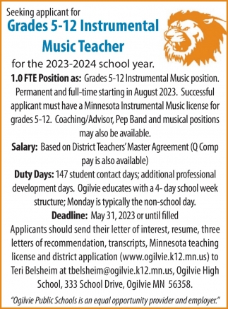• Instrumental Music Teacher Job in Ogilvie, MN