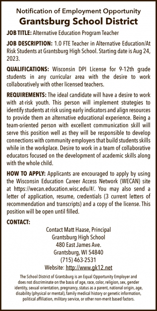 May 02, 2023. Grantsburg School District Jobs from Burnett County Sentinel
