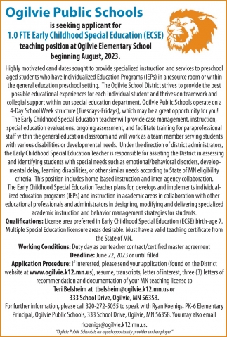 • Early Childhood Special Education Job Opportunity in Ogilvie, MN