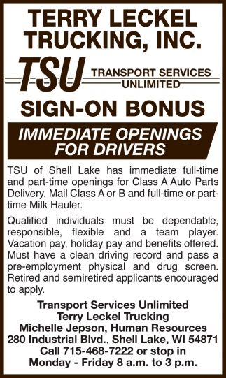 May 09, 2023. Terry Leckel Trucking, Inc. Jobs from Burnett County Sentinel