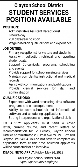 May 16, 2023. Clayton School District Jobs from Amery Free Press