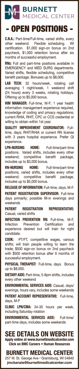 Jun 27, 2023. Burnett Medical Center Jobs from Burnett County Sentinel