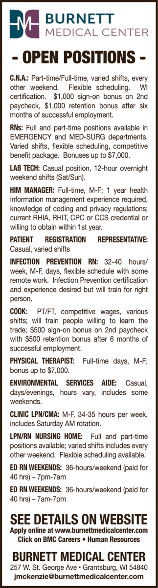 Aug 22, 2023. Burnett Medical Center Jobs from Burnett County Sentinel