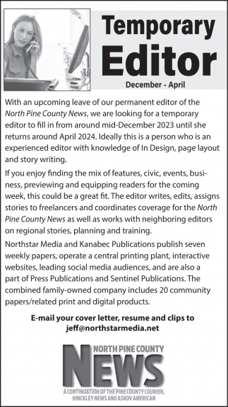 Sep 11, 2023. North Pine County News Jobs from Kanabec County Times