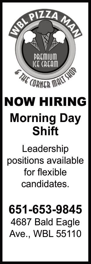 Sep 18, 2023. WBL Pizza Man & The Corner Malt Shop Jobs from White Bear Press