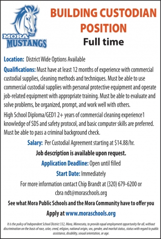 • Building Custodian Job Opening in Mora, MN