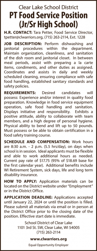 Jan 16, 2024. Clear Lake School District Jobs from Amery Free Press
