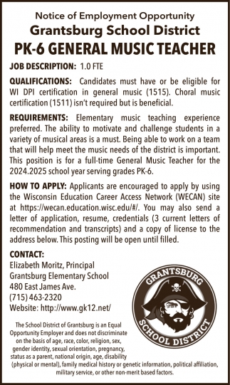 • General Music Teacher Job Opening in Grantsburg, WI