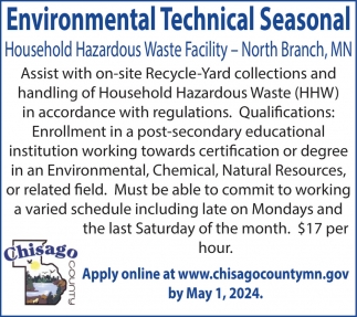 • Environmental Technical Seasonal Position Available in Center City, MN