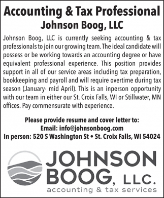 Jobs for Johnson Boog, LLC in Saint Croix Falls, WI