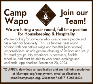 Sep 03, 2024. Camp Wapo Jobs from Amery Free Press