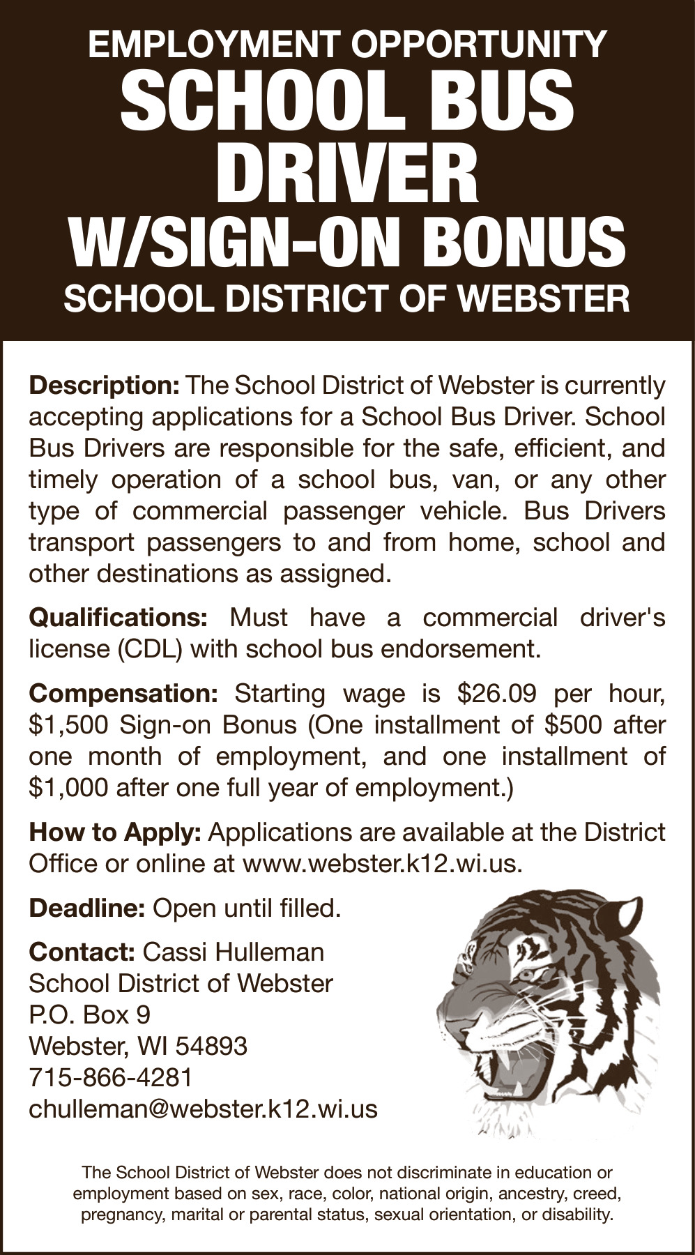 Oct 01, 2025. School District Of Webster Jobs from Burnett County Sentinel