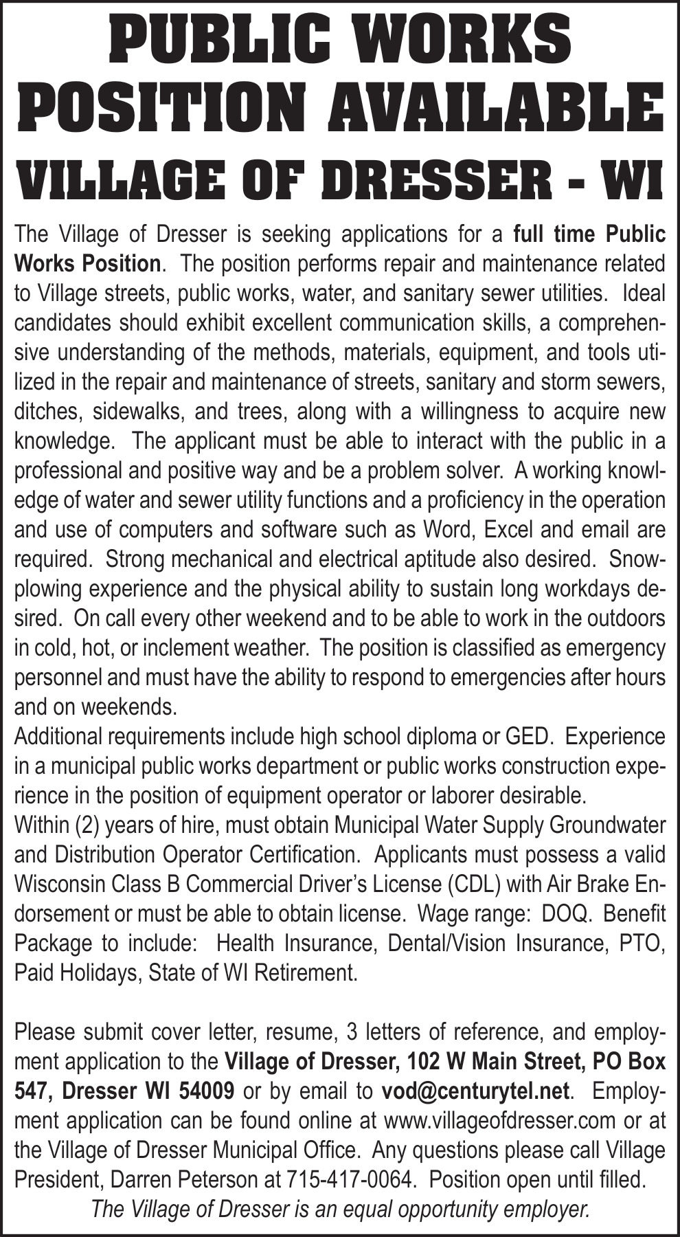 Oct 09, 2025. Village of Dresser Jobs from The Sun
