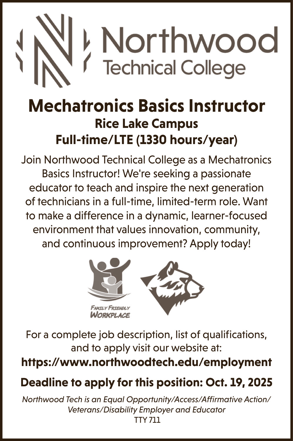 Oct 14, 2025. Northwood Technical College - Rice Lake Campus Jobs from Amery Free Press