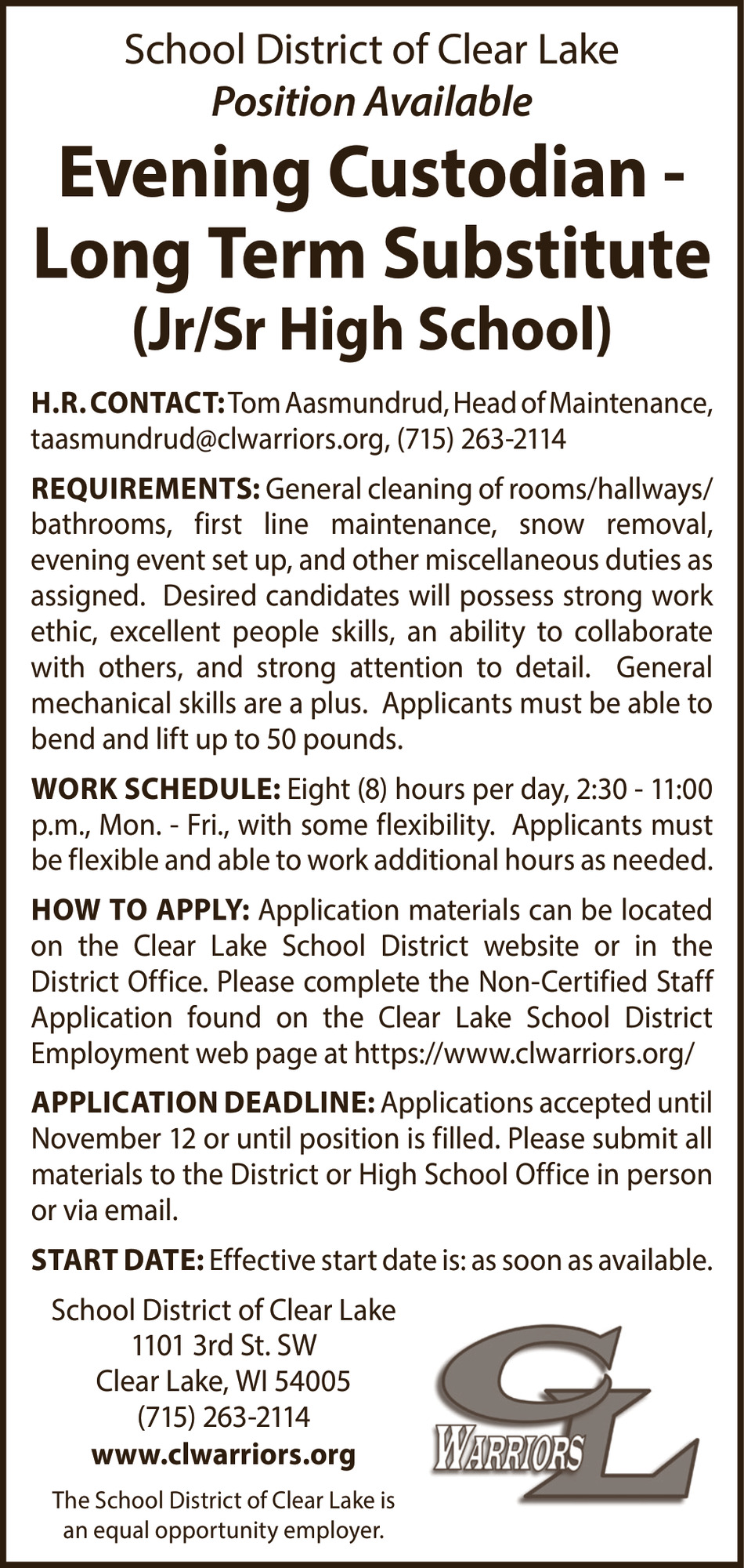 Nov 18, 2025. School District Of Clear Lake Jobs from Amery Free Press