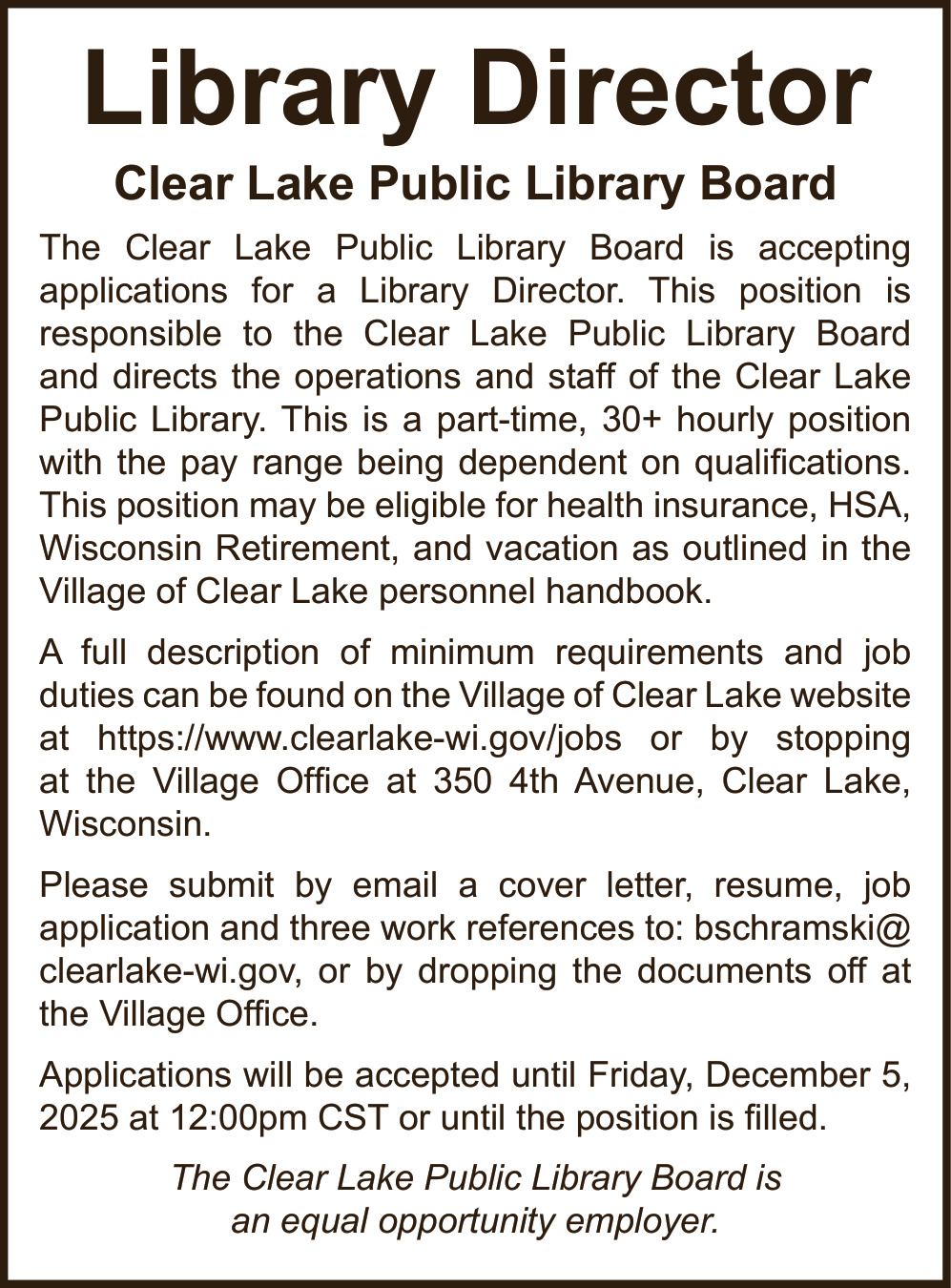 Dec 02, 2025. Clear Lake Public Library Jobs from Amery Free Press