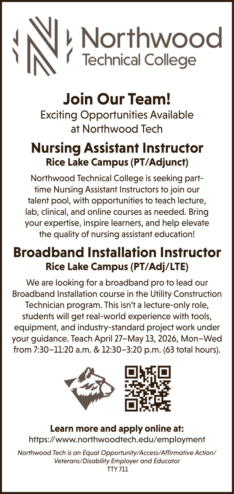 Dec 02, 2025. Northwood Technical College - Rice Lake Campus Jobs from Amery Free Press