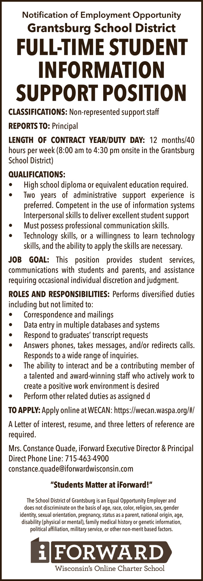 • Student Information Support Job Opening in Grantsburg, WI