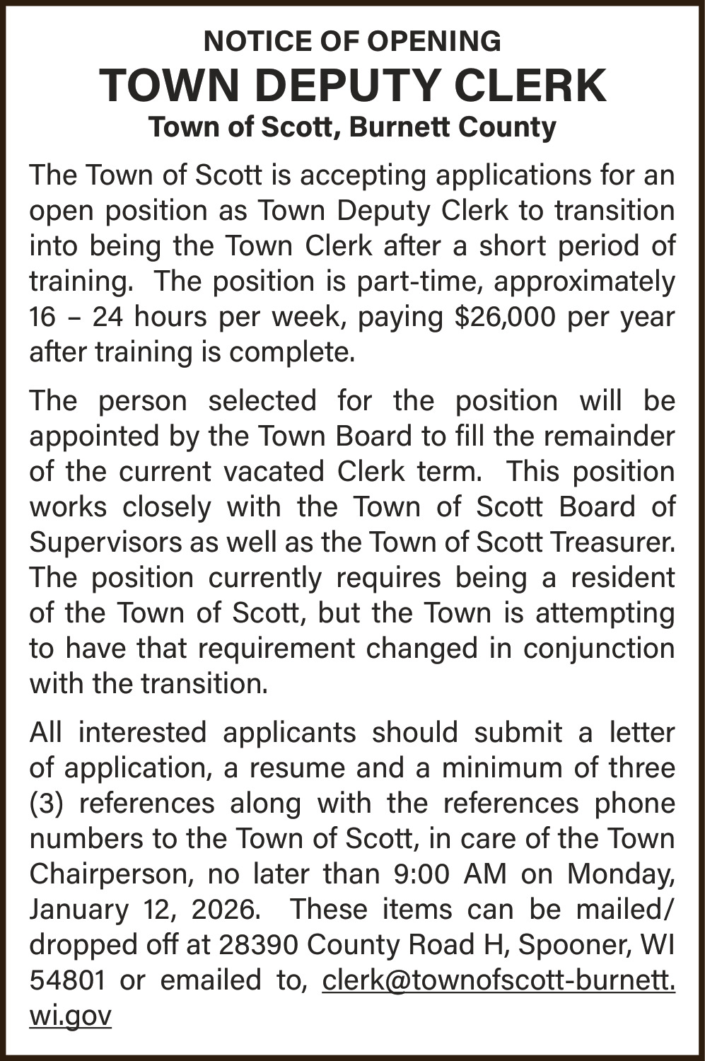 Dec 30, 2025. Town Of Scott Jobs from Burnett County Sentinel