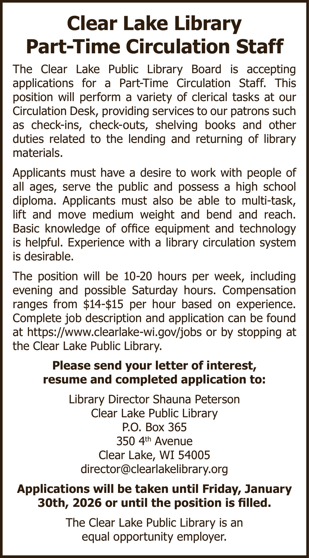 Jan 13, 2026. Clear Lake Public Library Jobs from Amery Free Press